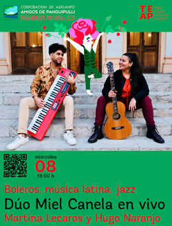 El miércoles 8 de octubre a las 19:00 horas, el escenario se llenará de romanticismo y sonoridades latinoamericanas con la presentación del dúo Miel Canela, integrado por Martina Lecaros y Hugo Naranjo. Los músicos llegan a Panguipulli para compartir su nuevo álbum Estaciones del Amor, un recorrido por el bolero y la música latina que busca traer de vuelta los sonidos y emociones de la música chilena y latinoamericana. Una noche para disfrutar, recordar y dejarse llevar por la calidez de sus melodías.